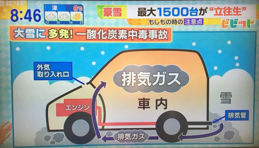 車が雪で埋もれた場合はマフラー周りを除雪しないと排気ガスが下から前に回って一酸化炭素中毒になる恐れがあるので注意 Togetter