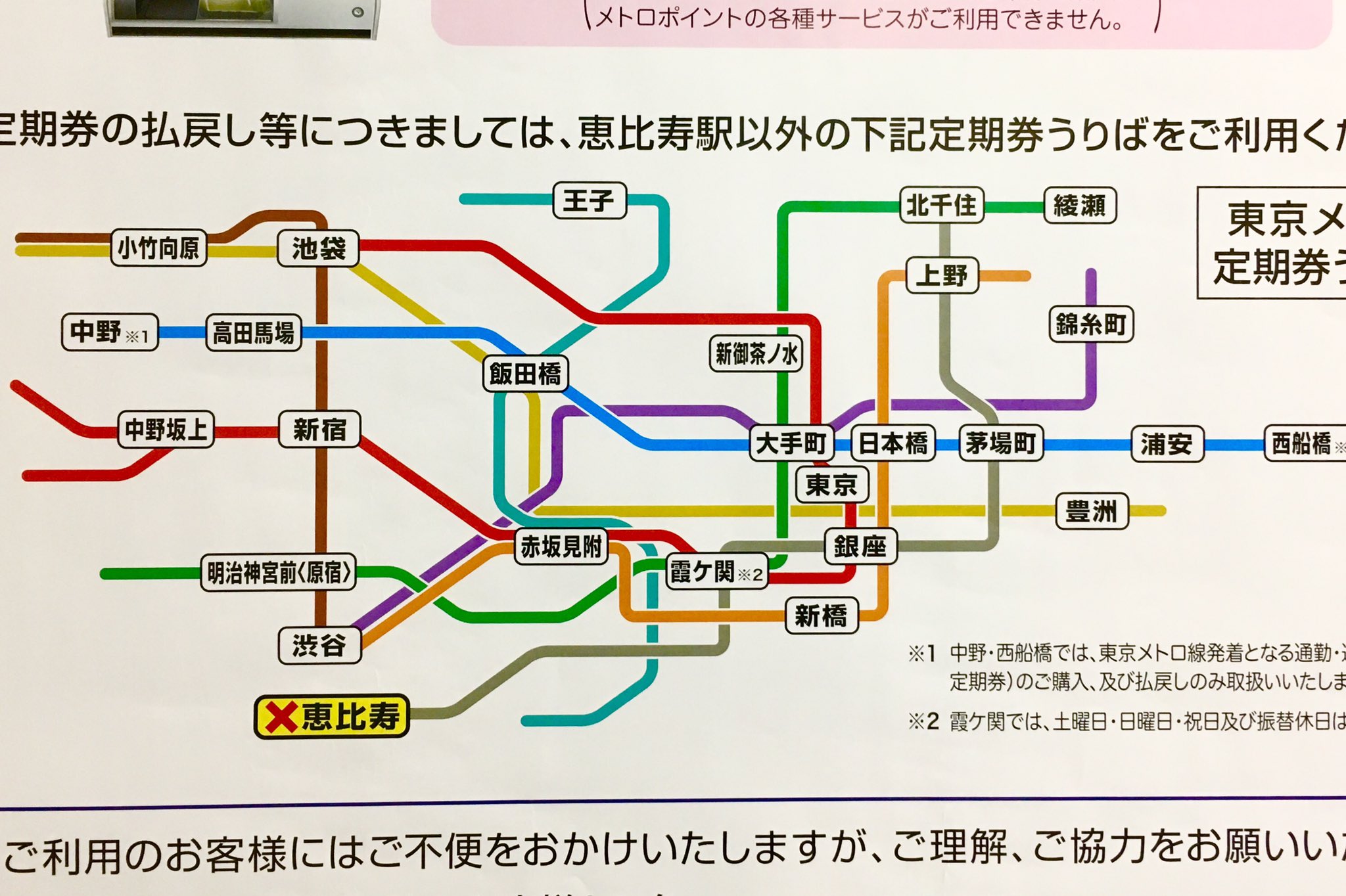 井上マサキ در توییتر 東京メトロ 恵比寿駅 定期券売り場一時休止について に掲載の 定期券うりばがある駅を示した路線図 斜線の角度がゆるくてスッキリ 線の交差の上下は現実に即している予感 銀座線が浅い 路線図