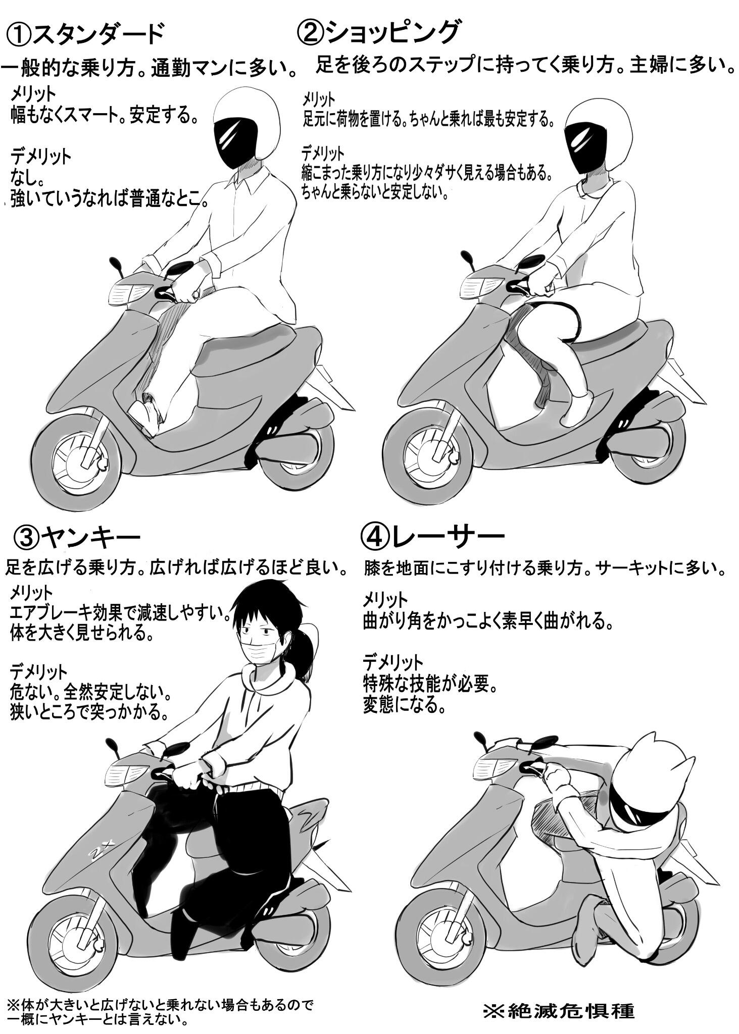 ロドル در توییتر Famy Siraso 誰でもわかるスクーターの乗り方 Http T Co Pn2ne3yegs 俺は2と3の複合だわ 普段大型に乗ってると原付に乗る時は無意識に足を横に開いてしまう